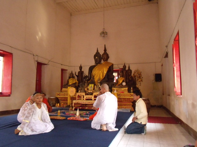 真ん中辺りに白い服を着たお坊さんがいて、その人が今回出家する人のようです。
