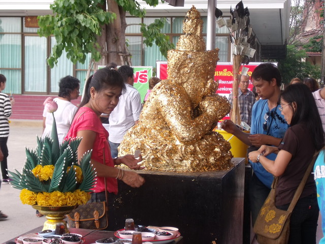 このお寺、4点セット(線香、ロウソク、花、金箔)の金箔の量がとても多くて、この礼拝所の像の数だけあります。