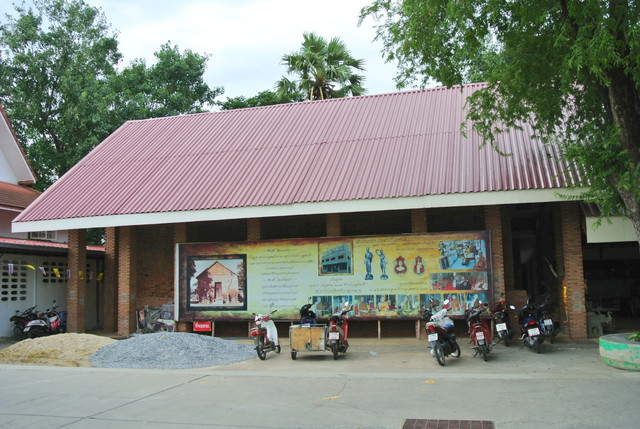 下の建物の壁にいろんなお寺のチェディーが描かれています。