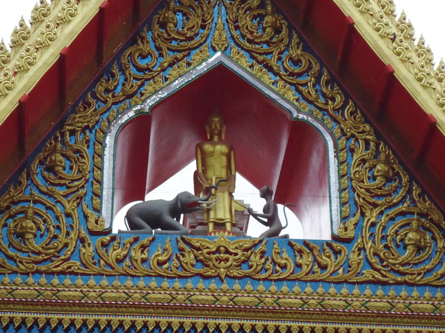 右からプラ・サンカチャイ、立仏、弥勒仏(布袋様)、立仏、プラ・シバリー、それから、一番左の立仏の両側に、なぜかゾウとサルが。