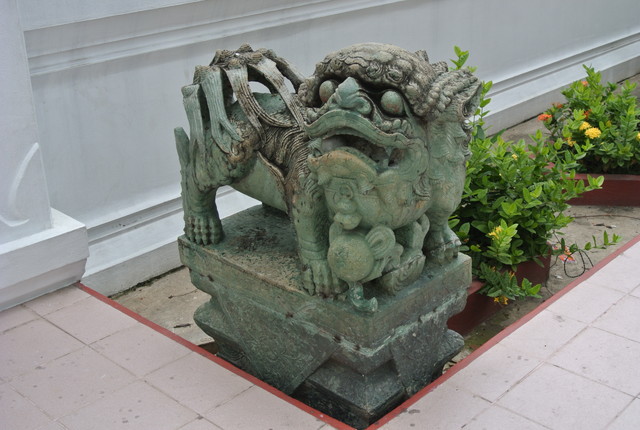 本堂を囲む塀の外、門の脇のシンハ。